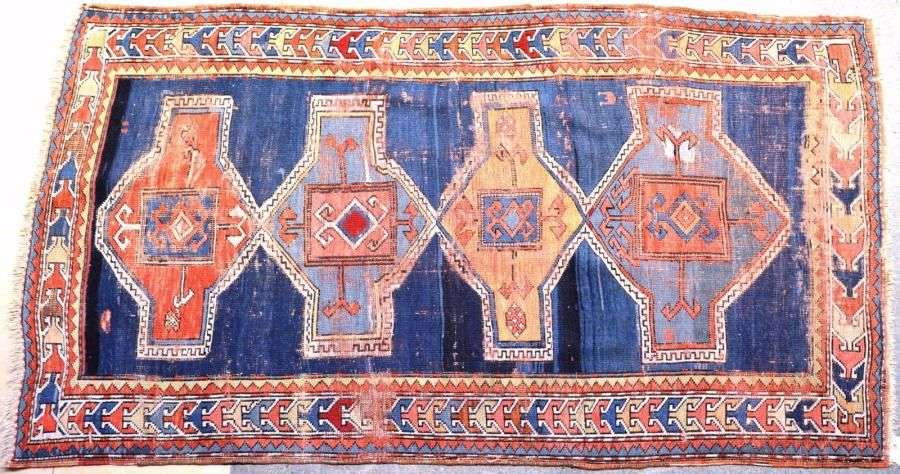 Petit tapis à décor géométrique sur fond bleu.