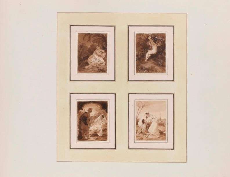 Quatre dessins sur un même montage, plume et encre brune, lavis brun