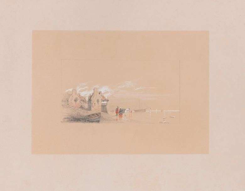 Pierre noire, rehauts de blanc et d'aquarelle rouge