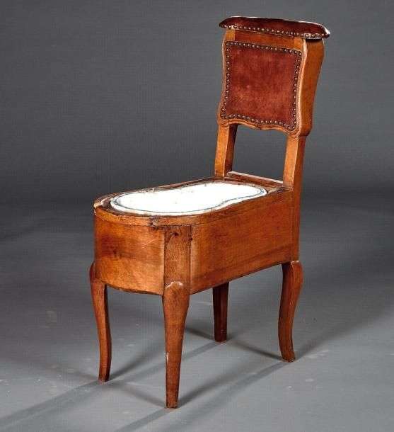Bidet en bois naturel, la cuvette en faïence d'un camaieu bleu, l'assise garnie de cuir cloutée.