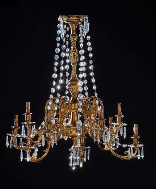 Petit lustre corbeille à douze bras de lumière à pampilles.