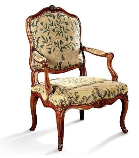 Fauteuil en bois naturel mouluré et sculpté, les accotoirs en coup de fouet et pieds cambrés. Garniture à décor de fleurs stylisées.