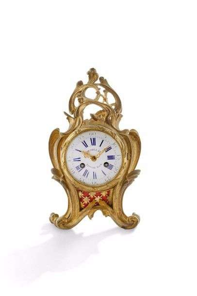 Belle petite pendule à poser en bronze ciselé et doré à décor d'encadrements de rinceaux et treillages stylisés sur fond de soie rouge.