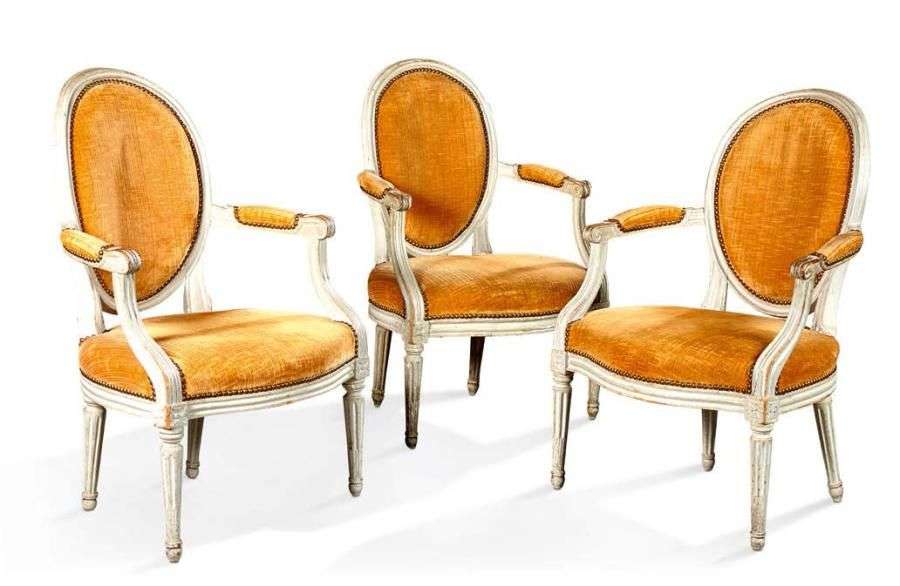 Suite de trois fauteuils cabriolets en bois mouluré et sculpté, rechampis