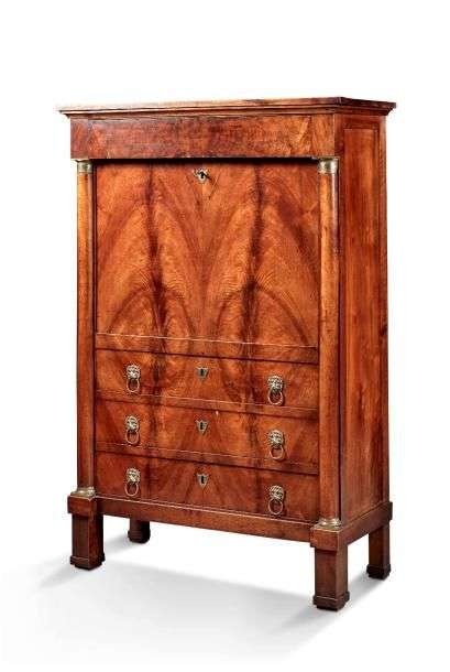 Secrétaire en placage de bois de ronce, ouvrant à trois tiroirs en partie basse et un abattant en partie haute encadrée de deux colonettes à ferrure mufle de lion en laiton doré, surmonté d'un tiroir.