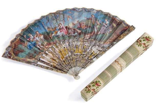 Feuilles à décor peint de différentes scènes galantes et d'un bateau.