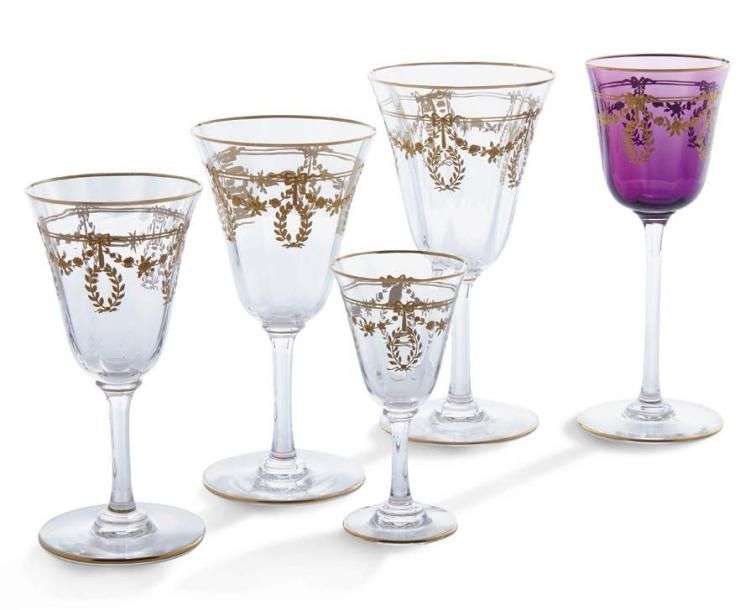 Partie de service de verres en cristal taillé et à décor appliqué de guirlandes dorées.