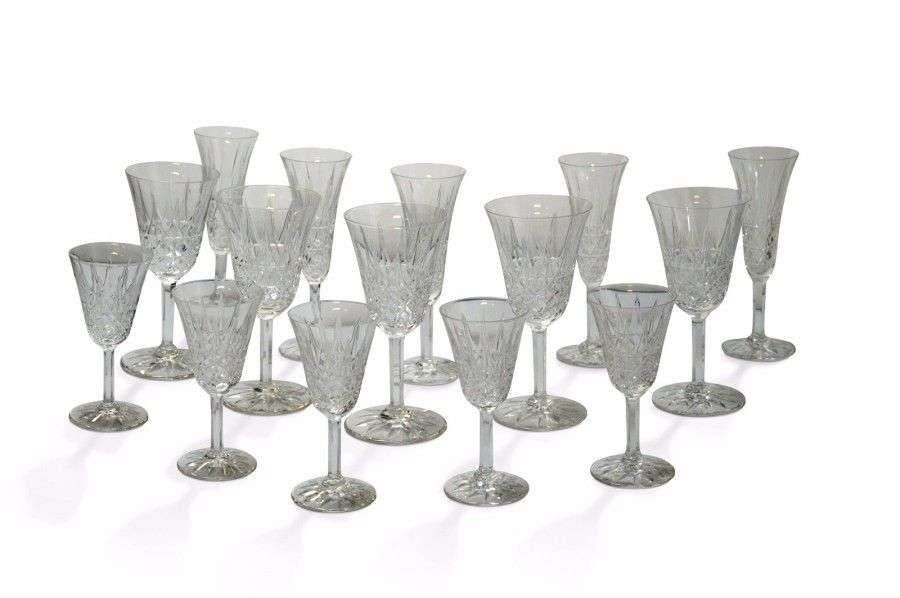 Service en cristal modèle Tarn comprenant: douze flûtes, vingt-quatre verres à vin, douze verres à eau, deux carafes, un pichet à eau (felé) et un pichet à orangeade
