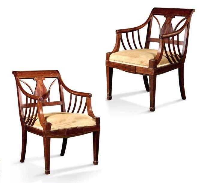 Paire de fauteuils à dossiers renversés en acajou blond mouluré, dossiers lyre marquetés de filets de bois cleirs.