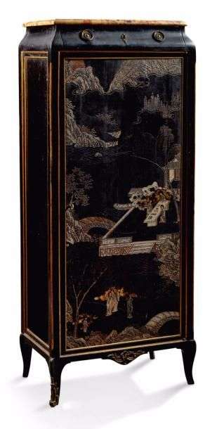 Beau cabinet en bois noirci à décor gravé figurant un paysage et une scène de lettrés dans le jardin d'une maison. Il ouvre à une porte et un tiroir. il repose sur quatre pieds cambrés. Petit plateau de marbre brèche.
