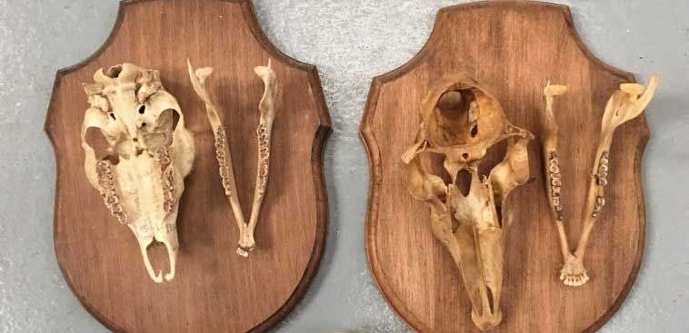 Un ensemble comprenant: - 2 sections de crâne de Chevreuil d'Europe (Capreolus capreolus) (CH) avec dentition et mandibule montées sur écusson