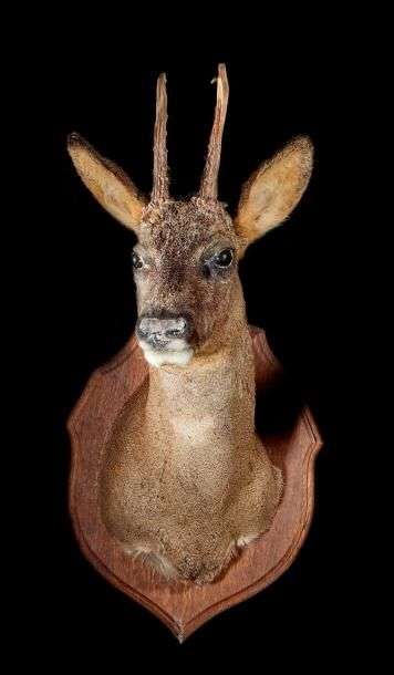 Chevreuil d'Europe (Capreolus capreolus) (CH): tête naturalisée d'un spécimen portant 4 cors montée sur écusson