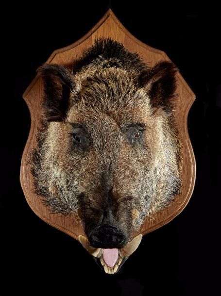 Sanglier d'Europe (Sus scrofa) (CH): tête naturalisée d'un grand mâle bien armé montée gueule ouverte sur écusson avec indications au dos de l'écusson «22/11/1982 Colombarault»