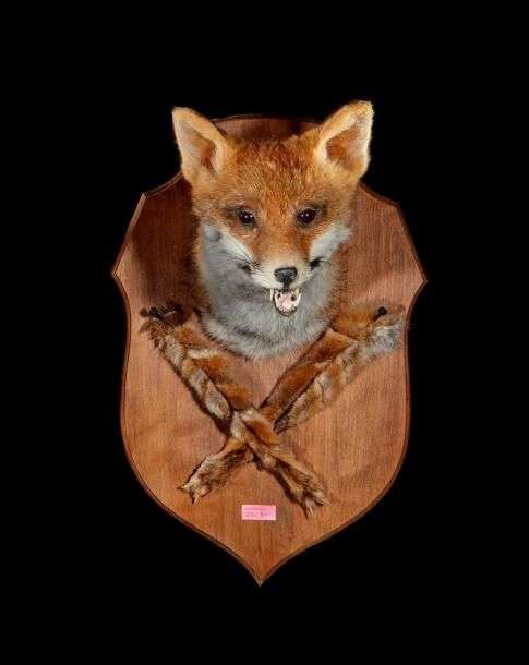 Renard roux (Vulpes vulpes) (CH): tête naturalisée gueule ouvert avec vraie dentition et pieds d'honneur montés sur écusson, prélevé en 1979 ou 1980 à Messarge