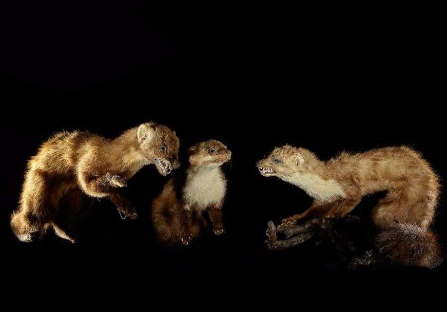 Un ensemble de trois spécimens comprenant une Martre des pins (Martes martes) (CH) naturalisée gueule ouverte sans socle et deux