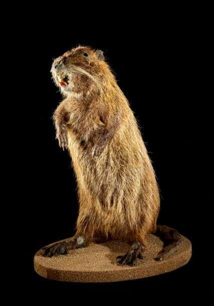 Ragondin (Myocastor coypus) (CH): spécimen naturalisé gueule ouverte en position bipède monté sur plateau sablé
