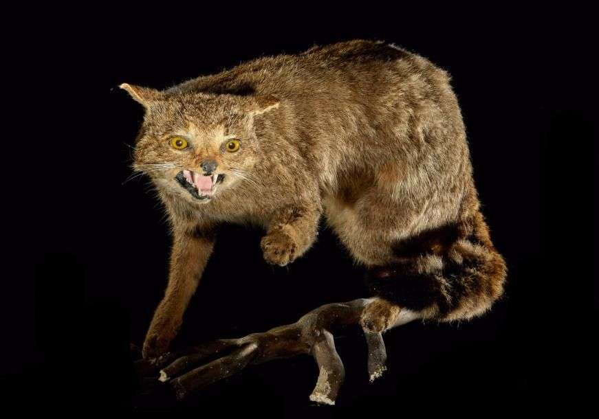 Chat sauvage (Felis silvestris) (II/A-CE): spécimen naturalisé gueule ouve