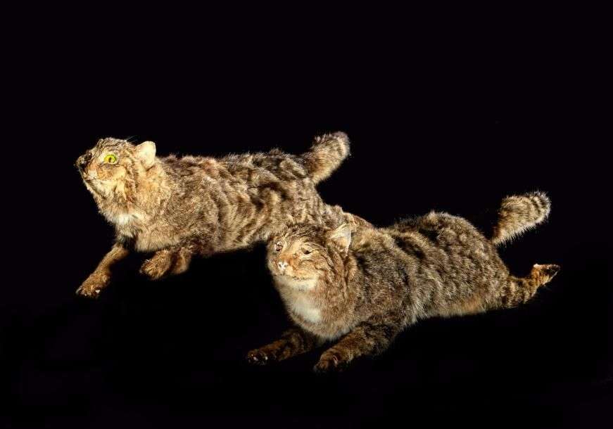 Chat sauvage (Felis silvestris) (II/A-CE): un ensemble de 2 spécimens naturalisés en attitude de saut, sans socle. Les yeux sont manquants sur un des spécimens Longueur totale 83 cm et 87 cm environ