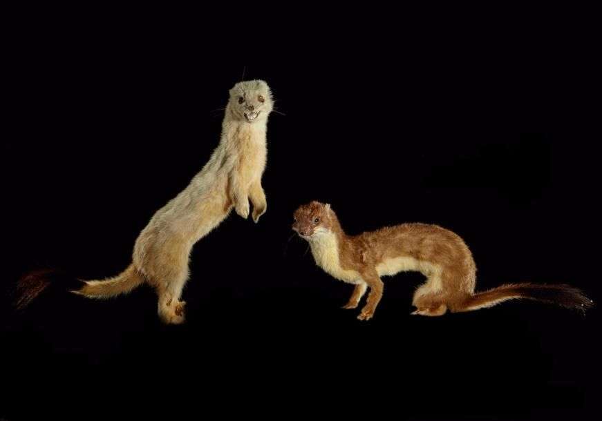 Un ensemble de 2 spécimens d'Hermine (Mustela erminea) (CH) naturalisés av