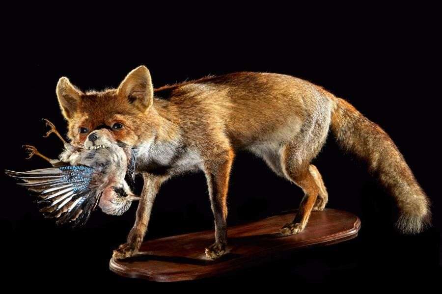 Renard roux (Vulpes vulpes) (CH): spécimen naturalisé tenant un Geai des c