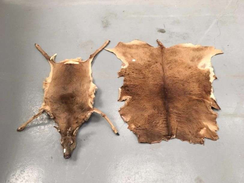 Un ensemble de 2 peaux: 1 peau de Chevreuil d'Europe (Capreolus capreolus) (CH) avec tête reconstituée et 1 belle peau de Cerf élaphe (Cervus elaphus) (CH)