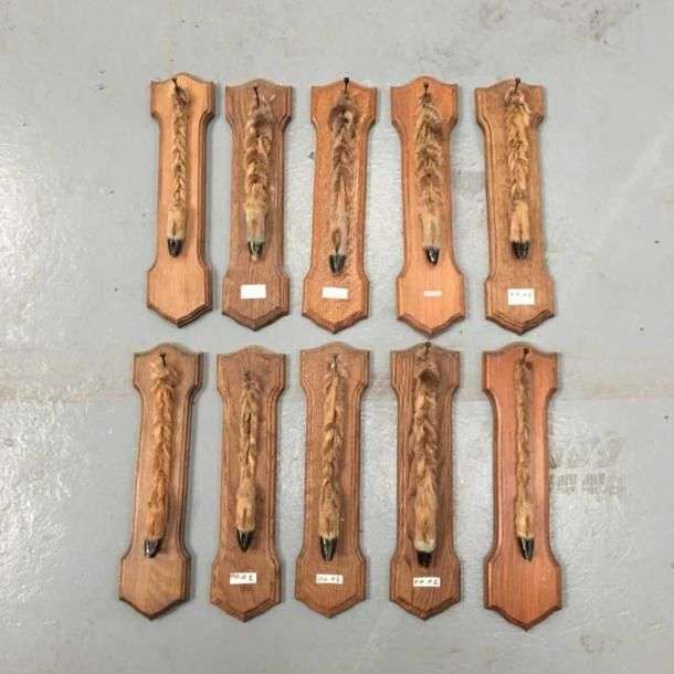 Un ensemble comprenant 10 plaques de pieds de cervidés montés et tressés en honneur collectés et préparés par Gérard Paquet