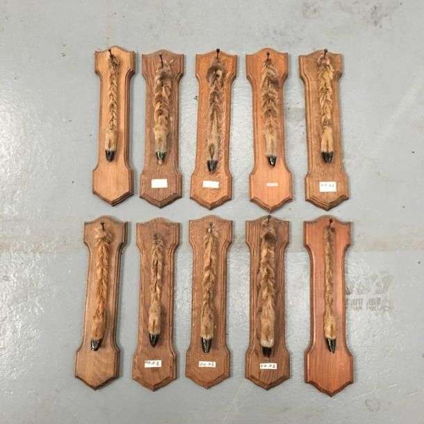 Un ensemble comprenant 10 plaques de pieds de cervidés montés et tressés en honneur collectés et préparés par Gérard Paquet