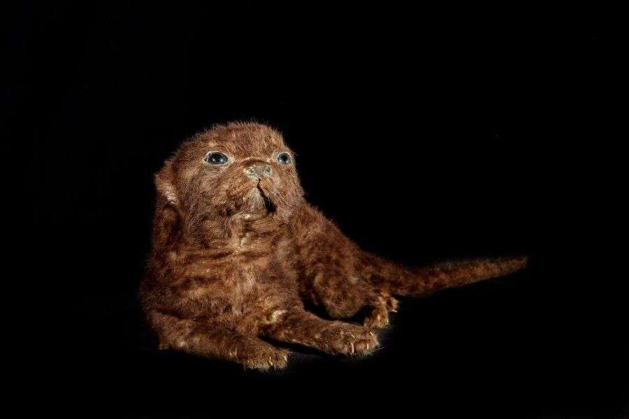 Panthère (Panthera pardus) (I/A): rare spécimen juvénile en morphe mélanique naturalisé en position couchée, sans socle