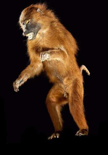 Babouin jaune (Papio cynocephalus) (II/B): spécimen ancien naturalisé gueule ouverte en position bipède sur socle provisoire