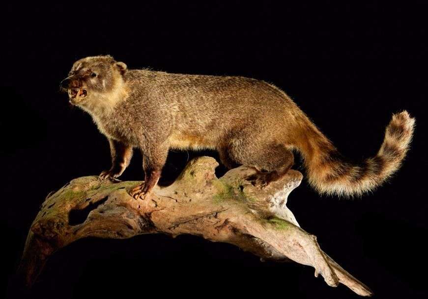 Coati (Nasua narica) (III/C): spécimen naturalisé gueule ouverte avec vrai