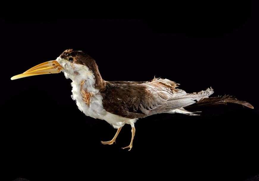 Bec en ciseaux (Rynchops niger) (NR): spécimen ancien naturalisé sur socle provisoire, abîmé.