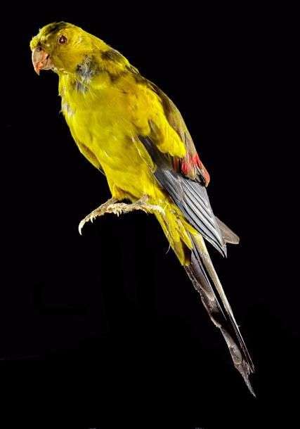 Perruche mélanure (Polytelis anthopeplus) (II/B): spécimen ancien naturalisé sur perchoir provisoire