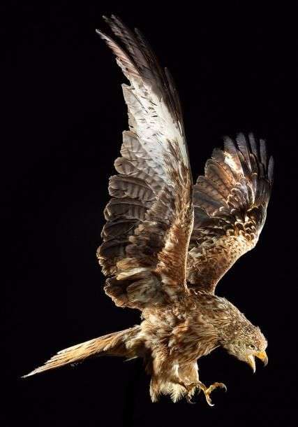 Milan royal (Milvus milvus) (II/A): beau spécimen ancien naturalisé en attitude de vol prêt à capturer une proie, sur socle en bois