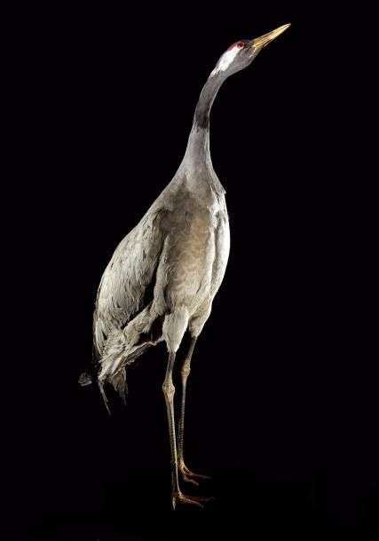 Grue cendrée (Grus grus) (II/A): spécimen naturalisé sur socle ovale (44,5 x 27 cm)