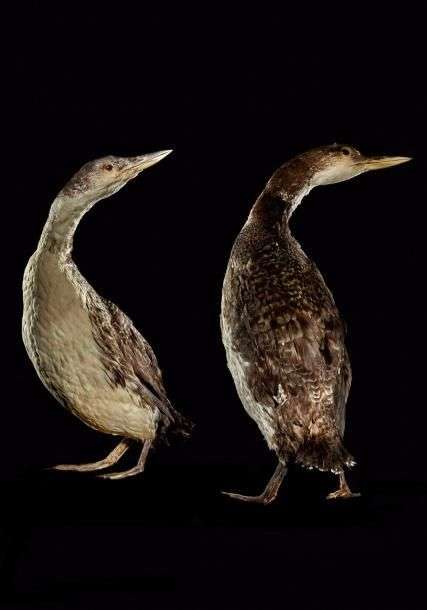 Plongeon spp vraisemblablement Plongeon imbrin (Gavia immer) (CE): 2 spécimens anciens naturalisés sur socle sablé