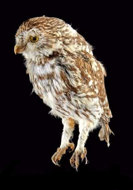 Chouette chevêche (Athene noctua) (II/A-CE): spécimen naturalisé sur socle provisoire