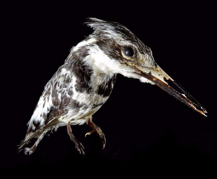 Martin-pêcheur pie (Ceryle rudis) (CE): spécimen ancien naturalisé sur socle provisoire.