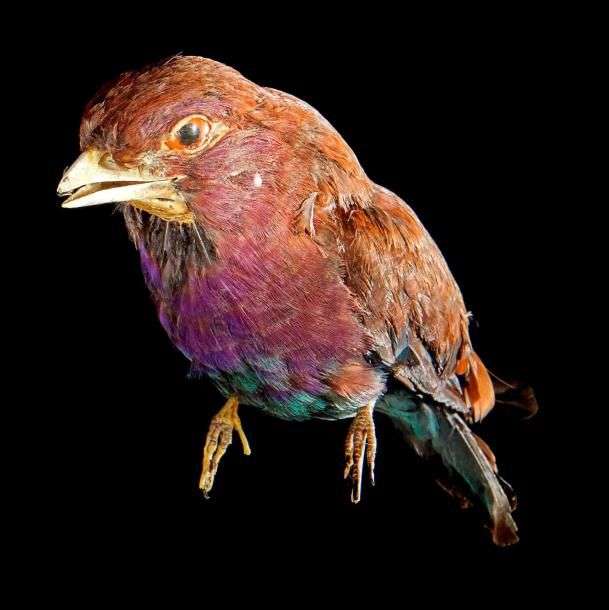 Rolle africain (Eurystomus glaucurus) (NR): spécimen naturalisé sur socle provisoire