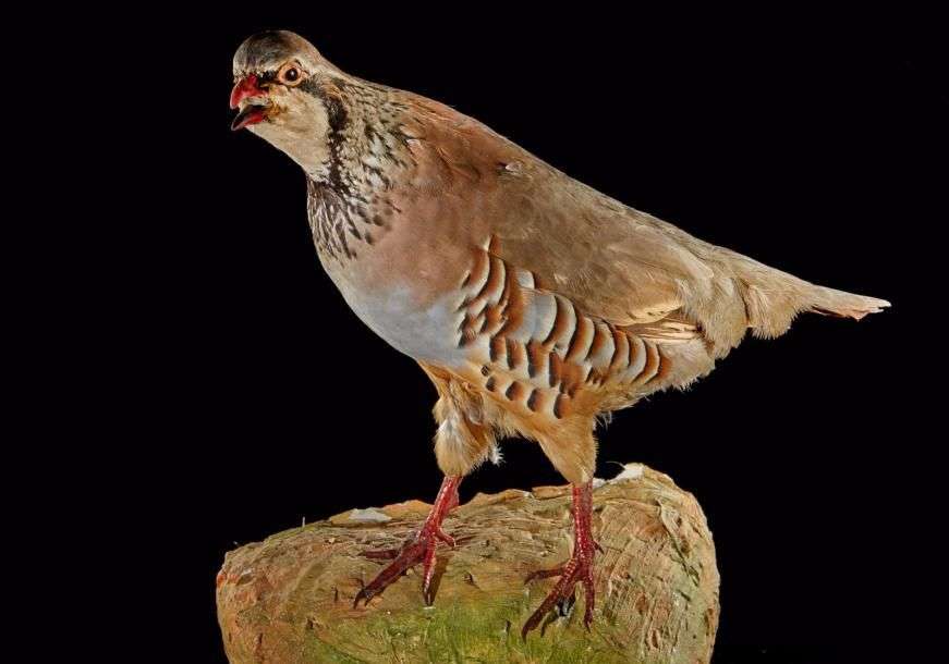 Perdrix rouge (Alectoris rufa) (CH): spécimen naturalisé sur rocher artificiel, prélevé en janvier 1979