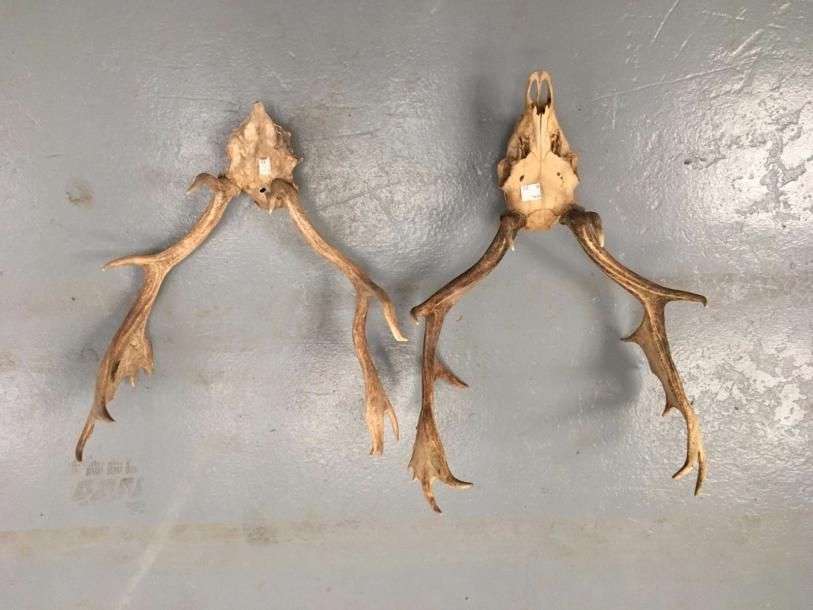 Un ensemble de 2 massacres de Daim (Dama dama) (CH) dont 1 frontal et 1 crâne avec dentition: belle symétrie et configuration des trophées