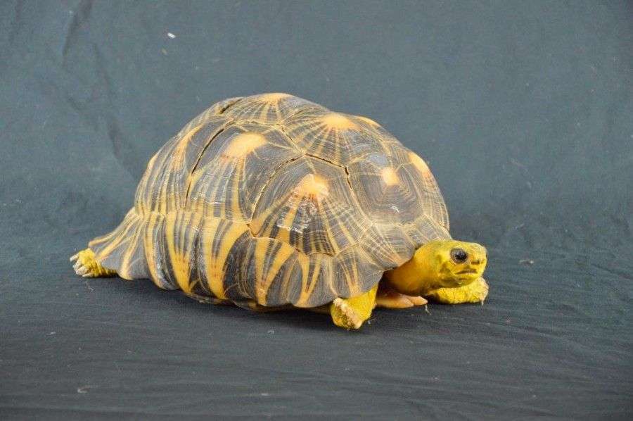 Tortue radiée de Madagascar (Astrochelys radiata) ou en synonymie (Testudo radiata) (I/A): spécimen naturalisé en attitude de marche d'une espèce de Cheloniidae endémique de Madagascar, espèce en voie de régression dans l'ensemble de son biotope insulaire