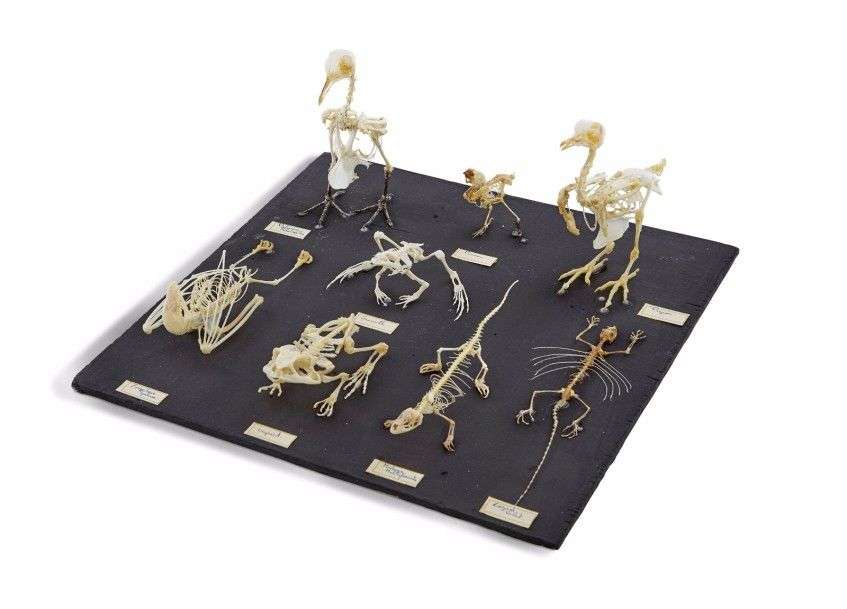Un ensemble de 8 montages ostéologiques sur plateau comprenant 2 batraciens spp, 2 reptiles dont 1 lézard volant (Draco volans) (NR), 1 chauve-souris (Eonycteris spelaea) (NR), 3 squelettes d'oiseaux dont
