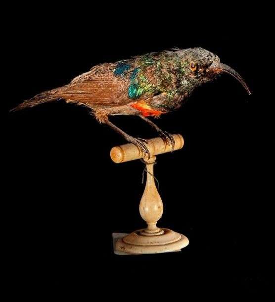 Souimanga minule (Cinnyris minullus) (NR): spécimen naturalisé sur socle en os travaillé type muséum