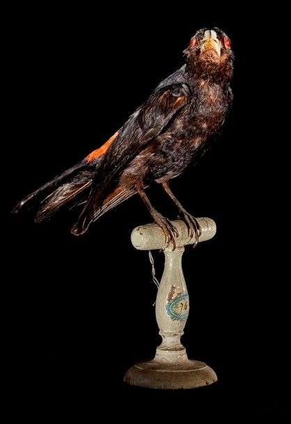 Cassique cul-rouge (Cacicus haemorrhous) (NR): spécimen naturalisé sur socle type muséum