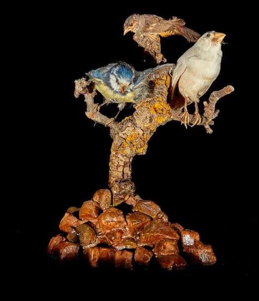 Un ensemble de 3 spécimens présentés sur branche et socle en plâtre compre
