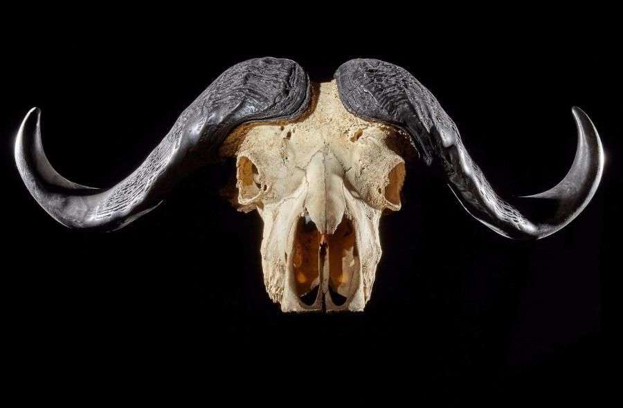 Buffle caffer (Syncerus caffer) (CH): crâne avec dentition monté sur socle