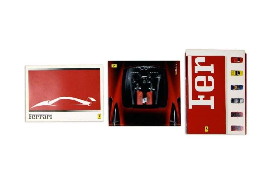 Lot comprenant: Un press-book 1996, en langue française, une brochure de Charles Pozzi 1980, en langue française, un dépliant sur l'entreprise Ferrari en 1989, en langue italienne, deux catalogues Ferrari années 1980, en langue française et uUn dépliant de la gamme Ferrari de 1994, en langues multiples