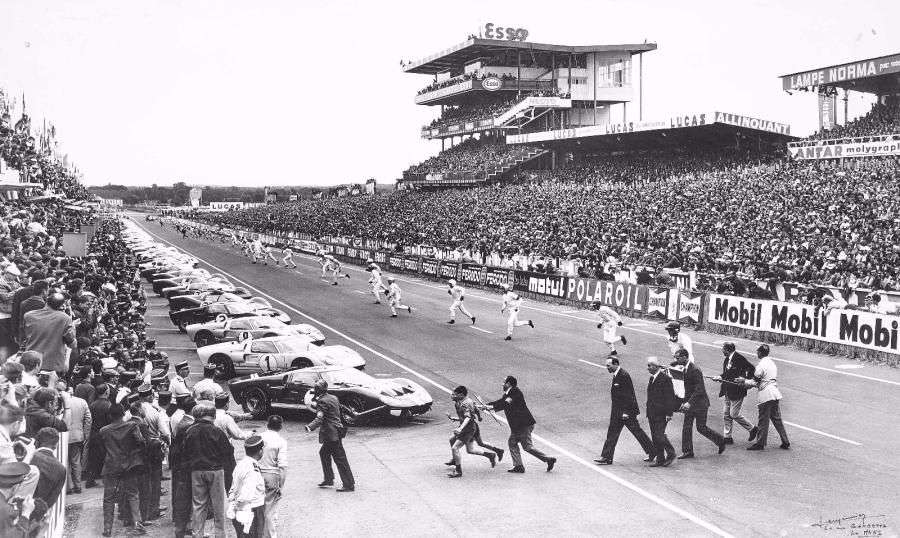 Photo contrecollée sur bois, représentant le départ de l'édition 1966 des 24 Heures du Mans