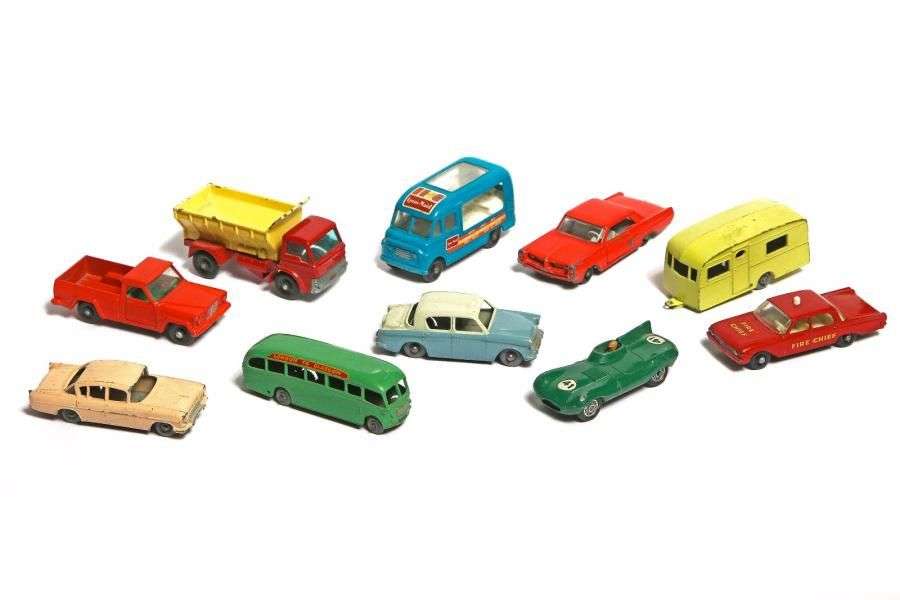 Lot de 9 miniaturtes, comprenant: »D» TYPE JAGUAR, N°40, VAUXHALL CRESTA, N°23, HILLMAN MINX, N°43, PONTIAC GP SPORTS COUPE avec Caravane Berkeley Cavalier, N°923, FORD FAIRLANE Fire Chief's car, N°59, JEEP GLADIATOR, N°71, COMMER ICE CREAM CANTEEN, N°47, BEDFORD DUPLE LUXURY COACH «London to Glasgow», N°21, GRIT-SPREADING TRUCK, N°70
