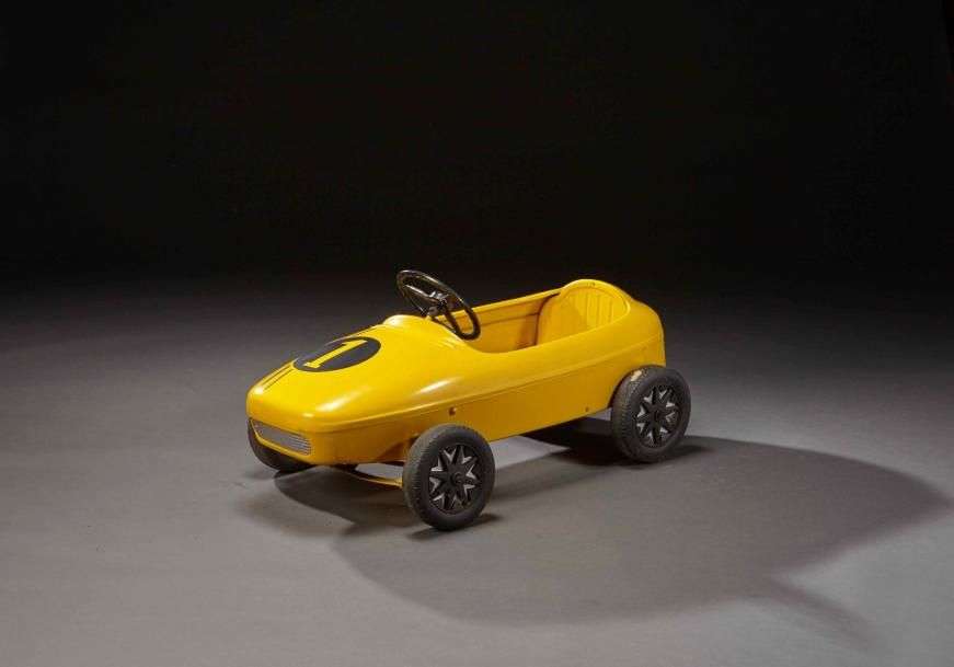 Voiture à pédales de type BABY COURSE en tôle. Jaune. Numéro 1
